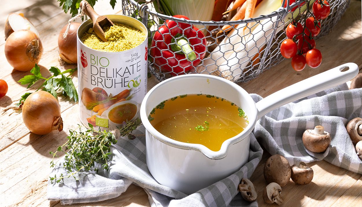 Eine delikate Brühe als Grundlage für Suppen oder Eintöpfe macht jedes Gericht zu einem Gedicht, und das ganz einfach! Eine wunderbare Kombination aus edlen Gewürzen und Kräutern hilft jedem kreativen Kopf in der Küche dabei, exquisite Menüs zu komponieren. Und nun gibt es unsere Gemüsebrühe in gewohnt bester Qualität auch in der Bio-Variante: Mit besten Bio-Zutaten, glutenfrei, vegan und ganz ohne Geschmacksverstärker!