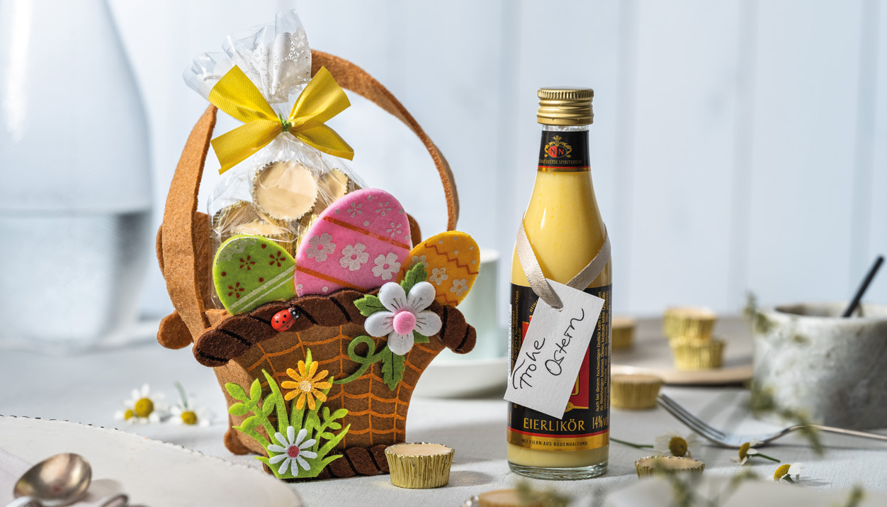 Das Eierlikör Präsentkörbchen ist ein kleines Highlight für alle, die Ostern mit einem Hauch von Eleganz und Süße feiern möchten. In der liebevoll gestalteten Filztasche versteckt sich eine kleine Flasche cremiger Eierlikör – ideal für genussvolle Momente – sowie köstliche Eierlikör-Süßigkeiten, die auf der Zunge zergehen.