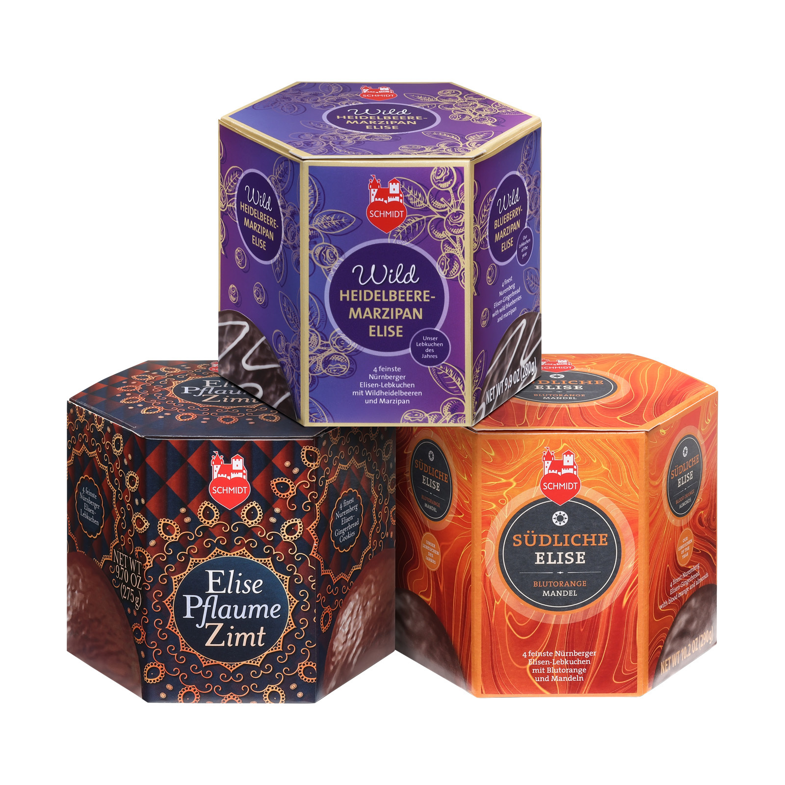 Ein Triumvirat des exquisiten Geschmacks erwartet Sie in diesem Set von Lebkuchen-Schmidt: Die Elise Pflaume-Zimt, Südliche Elise und ganz neu unser Lebkuchen des Jahres: Wildheidelbeere-Marzipan-Elise!