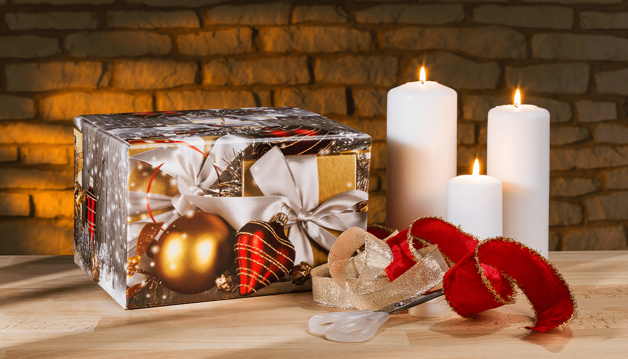Wenn Sie mit Geschenkpapier und Klebeband lieber nicht hantieren möchten, aber Ihre Geschenke dennoch perfekt eingepackt überreichen wollen, dann legen wir Ihnen unseren Geschenkkarton ans Herz. Diese hübsche Verpackung überzeugt einerseits optisch: Auf einem Hintergrund aus Holzlatten im Stil eines Alpenhäuschens wird weihnachtlich Stimmung gemacht, mit Christbaumkugeln, Glitzersternen und festlich verpackten Geschenken, alles in edlen Gold- und Rottönen. Schon alleine der Anblick sorgt dafür, dass es dem Empfänger warm ums Herz wird.