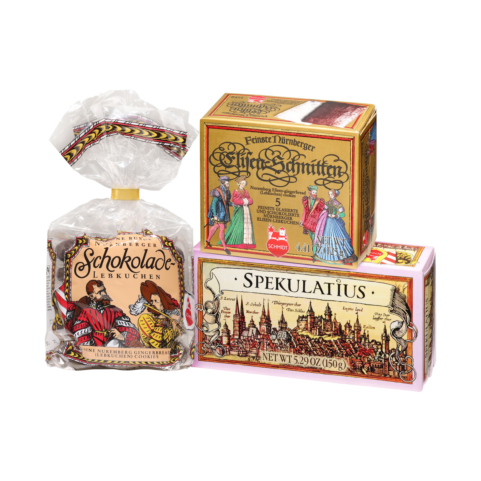 Feinste Elisenschnitten sind die Königinnen unter den Lebkuchen, mit wenig Mehl im Teig, dafür vielen Nüssen und Honig. Auf einer Oblate gebacken und mit Schokolade oder Zuckerguss überzogen, sind sie der Liebling der Lebkuchen-Genießer. Würzig wird es wiederum mit dem Spekulatius, den wir aus besten Zutaten backen. Abgerundet wird das Trio von einer Packung Nürnberger Schokoladen-Lebkuchen, einem Klassiker aus unserem Sortiment.