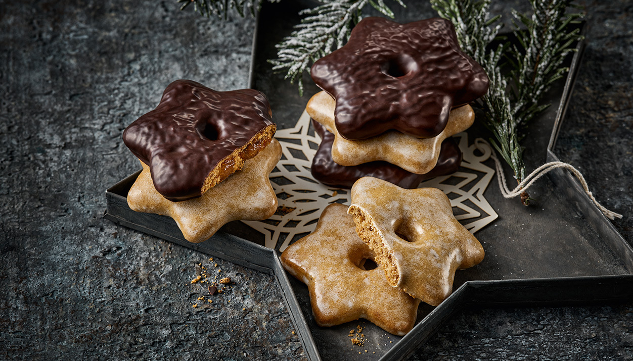 Wer's vielfältig mag, wird unsere Lebkuchensterne lieben! In dieser wunderbaren Kreation trifft die eine Hälfte der braunen Lebkuchen auf eine feine Orangenfruchtfüllung und Schokoladenüberzug und die andere Hälfte auf gemahlene Nüsse und Mandeln im Teig und eine leckere Zuckerglasur. Somit ist in unserer gemischten Packung für jeden etwas dabei! Der nussig-karamellige oder fruchtig-süße weich gebackene Teig zergeht geradezu im Mund: Das nennen wir einen wahren Gaumenschmauß!