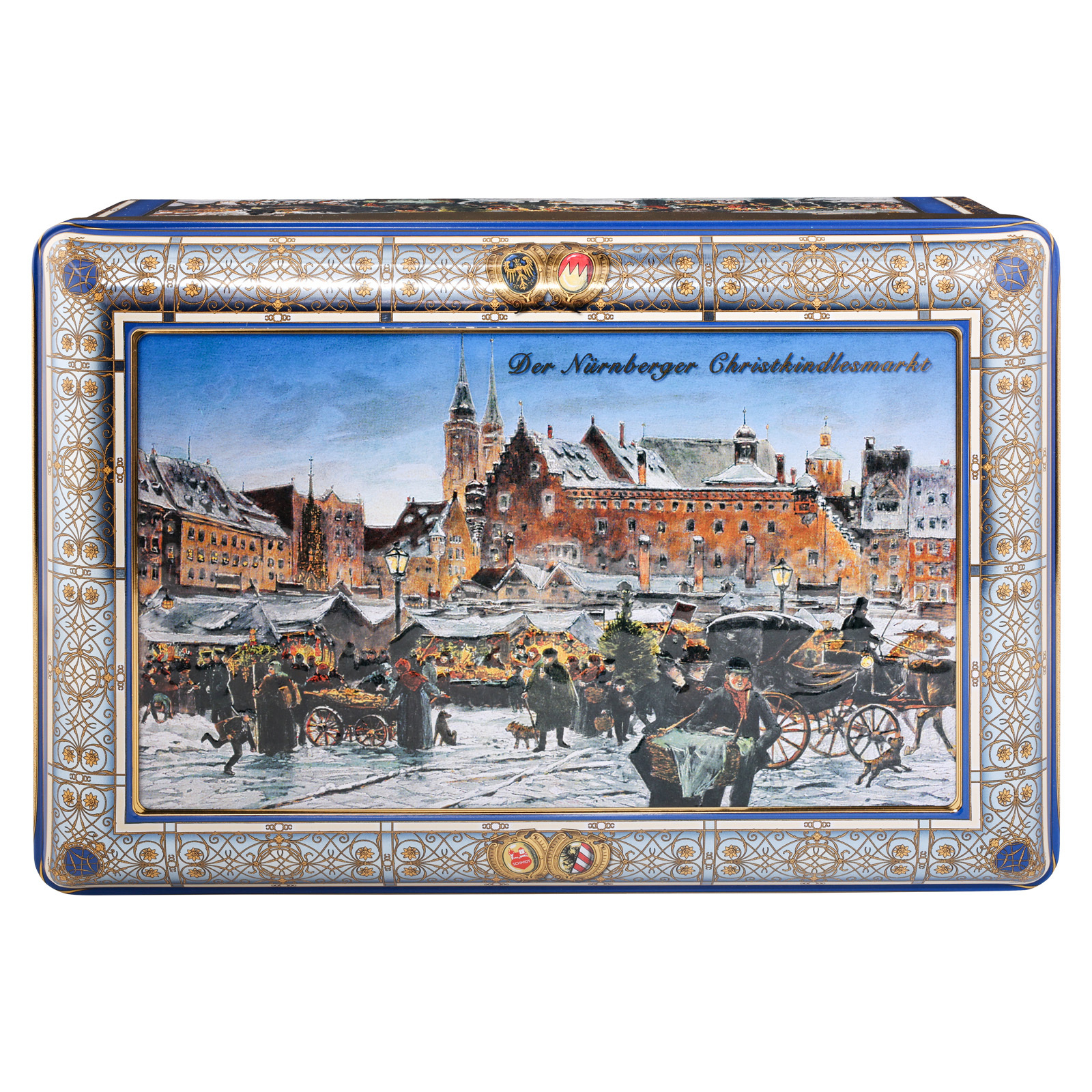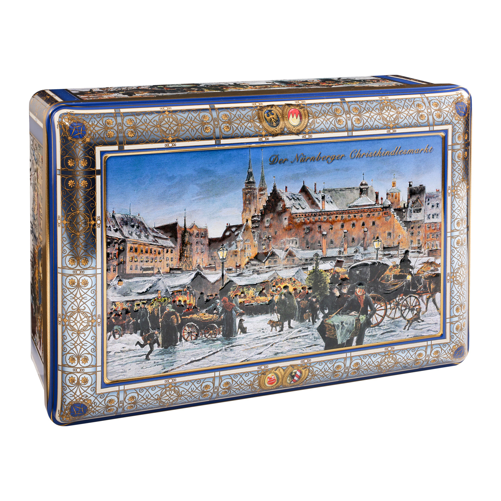 Ein ganz besonderes Geschenkepaket ist unsere Nürnberger Geschenk-Truhe: Aus Metall gearbeitet, ist die Truhe aufwändig mit Ornamenten und weiteren historischen Ansichten der Kaiserstadt verziert. Wenn sie dann einmal leer ist, kann man darin Kostbarkeiten aufbewahren oder auch einfach selbstgebackene Plätzchen oder Lebkuchen.