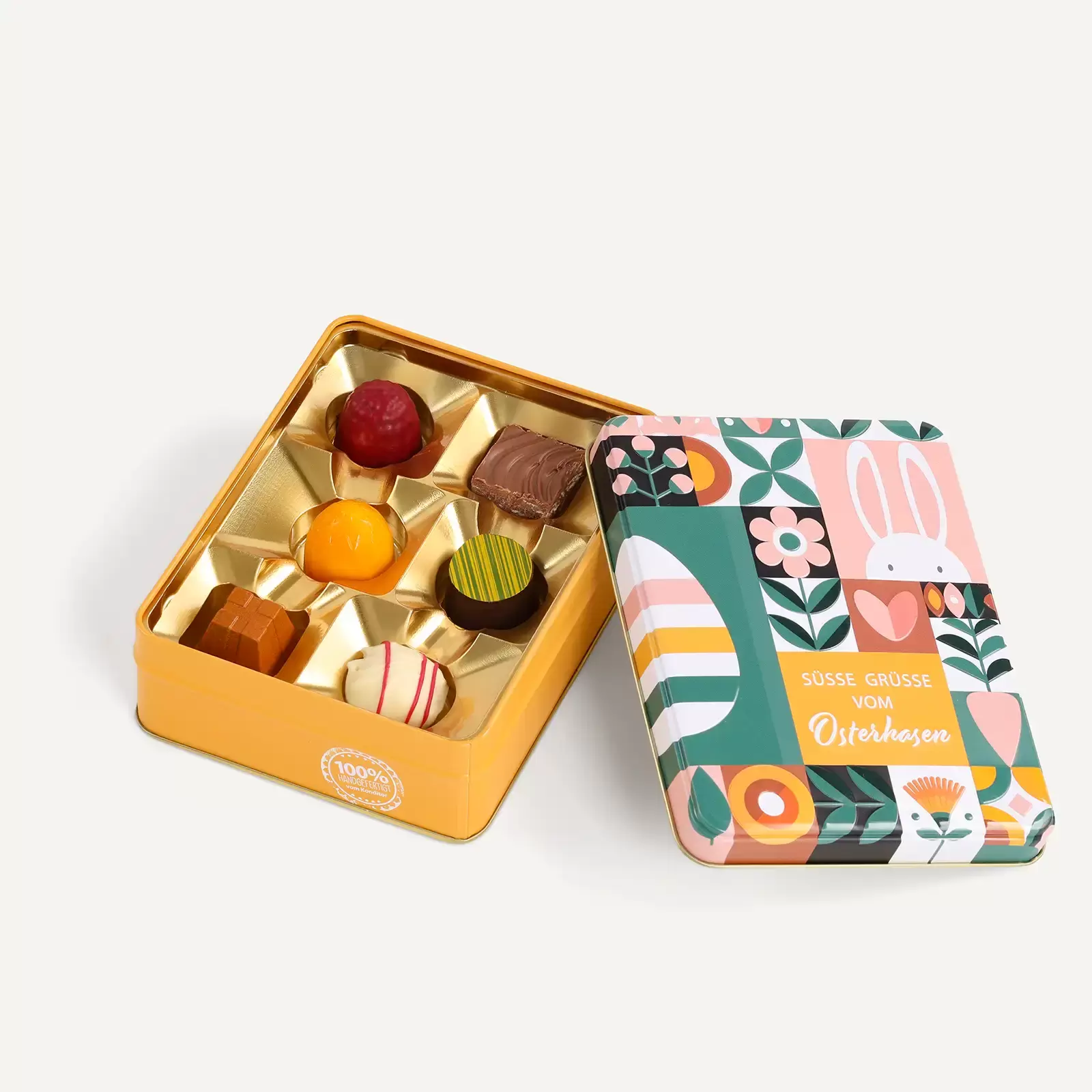 Frühlingsfrisch und in einem zartem Farbenmix präsentiert sich die kleine Metalldose. Halb in nostalgischem Retrostil, halb in angesagtem skandinavischem Design wirkt ihr Dekor mit bunten Blüten, Hasen und geschmückten Ostereiern frühlingshaft luftig und leicht. Der Inhalt steht der Verpackung in nichts nach: 6 handgefertigte Trüffel und Pralinen, die auch mal mit etwas außergewöhnlicheren Formen und Farben überraschen und das Auge erfreuen. Sie haben aber nicht nur optisch etwas zu bieten, sondern schmecken garantiert ebenso erlesen und fein wie ihr Design.