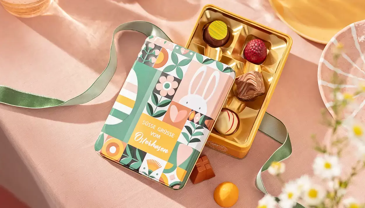 Wenn erste zarte Frühlingslüftchen wehen, ist es Zeit, etwas frischen Wind in die kommende Osterzeit zu bringen. Mit einer modern gestalteten Schmuckdose, gefüllt mit leicht extravagant verzierten Pralinenspezialitäten, können sich alle, die modernes, aber liebevolles Design lieben, noch mehr auf die Osterfesttage freuen.