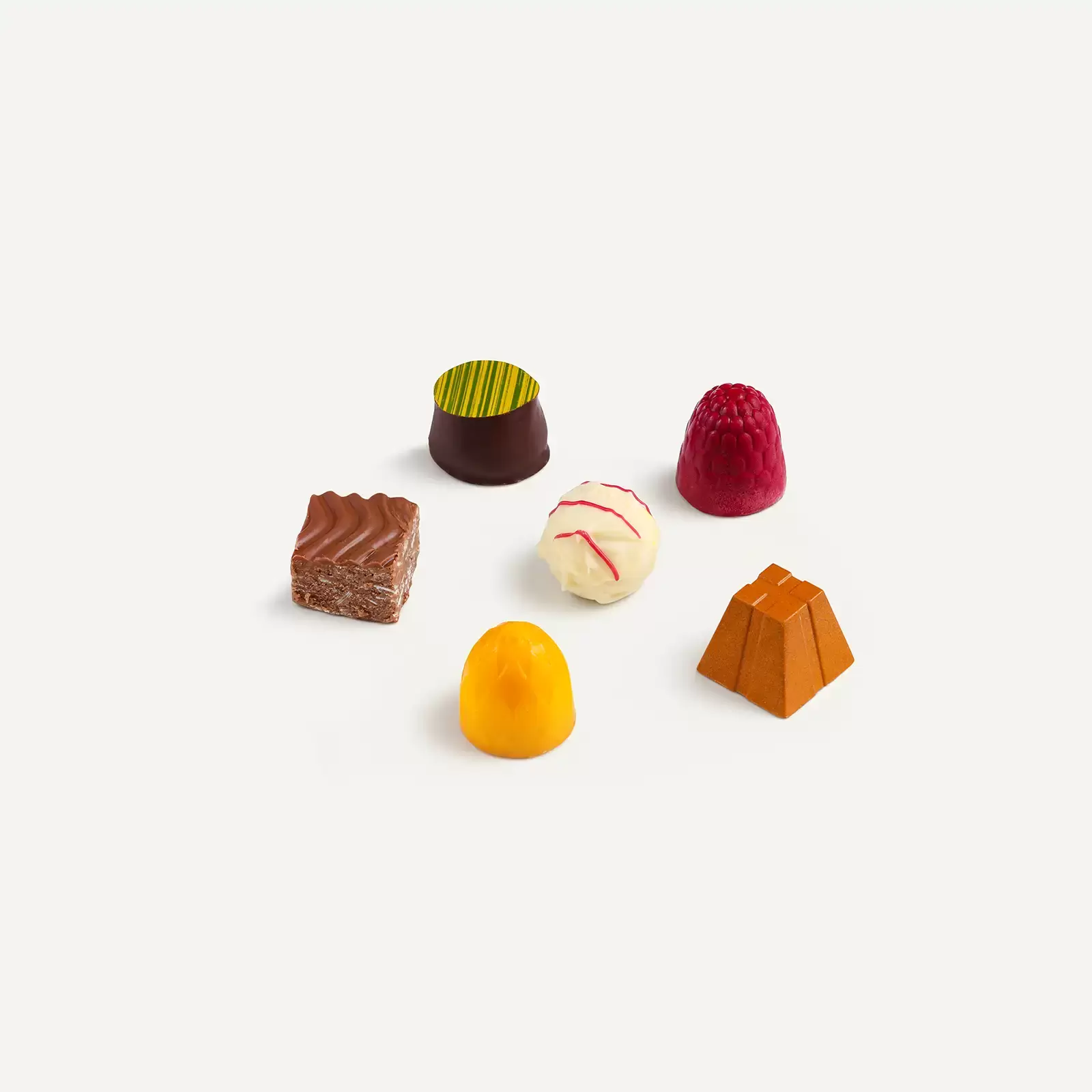 Im Einzelfall kann es vorkommen, dass nach dem Erscheinen dieser Produktinformation inhaltliche Änderungen erfolgt sind. Aus diesem Grund bitten wir Sie, vor dem Verzehr unserer Produkte die Zutatenliste und die Nährwertangaben auf der jeweiligen Verpackung zu beachten. Zutaten: Zucker, Kakaomasse, Kakaobutter, MANDELN, VOLLMILCHPULVER, SAHNE, HASELNÜSSE, BUTTER, Bienenhonig, Himbeermark, Mangomark, Erdbeermark, PISTAZIEN, Ingwermark, Salz, Gewürze, Emulgator: SOJALECITHIN; Säuerungsmittel: Zitronensäure; Farbstoffe: Betacarotin, echtes Karmin, Brilliantblau;