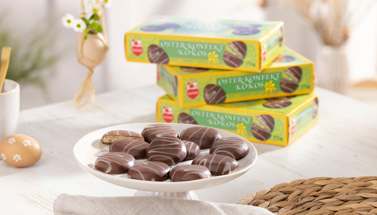 Haben Sie schon unser Osterkonfekt probiert? Für diese wunderbare Leckerei haben wir Kokos und Schokolade zusammengebracht: Der Kokosteig – natürlich nur aus besten Zutaten – mit Kokos-Geschmack wird von zart schmelzender Schokolade umhüllt: ein gebackenes Frühlingsgedicht auf Ihrer Kaffeetafel!
