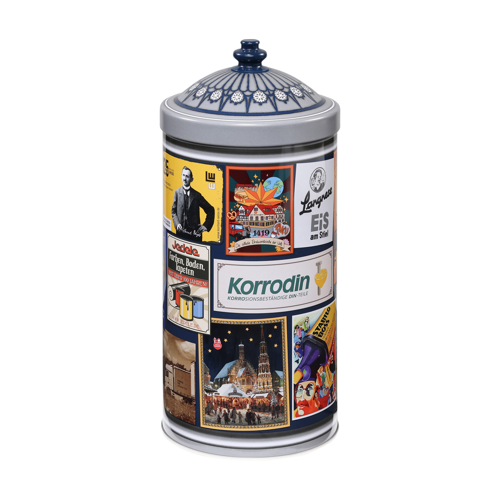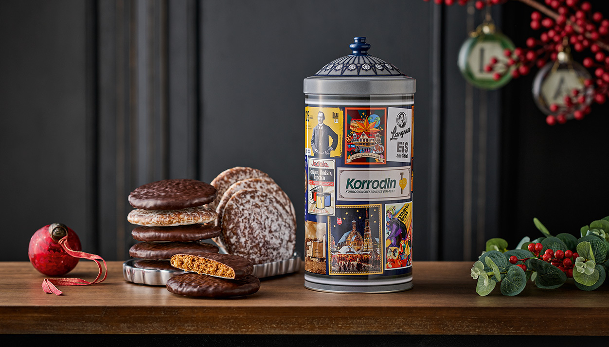 In the advertising column tin, naturally sweet pleasure awaits you or your friends. We filled them with ten mixed round Oblaten Lebkuchen. There is certainly something for everyone here.