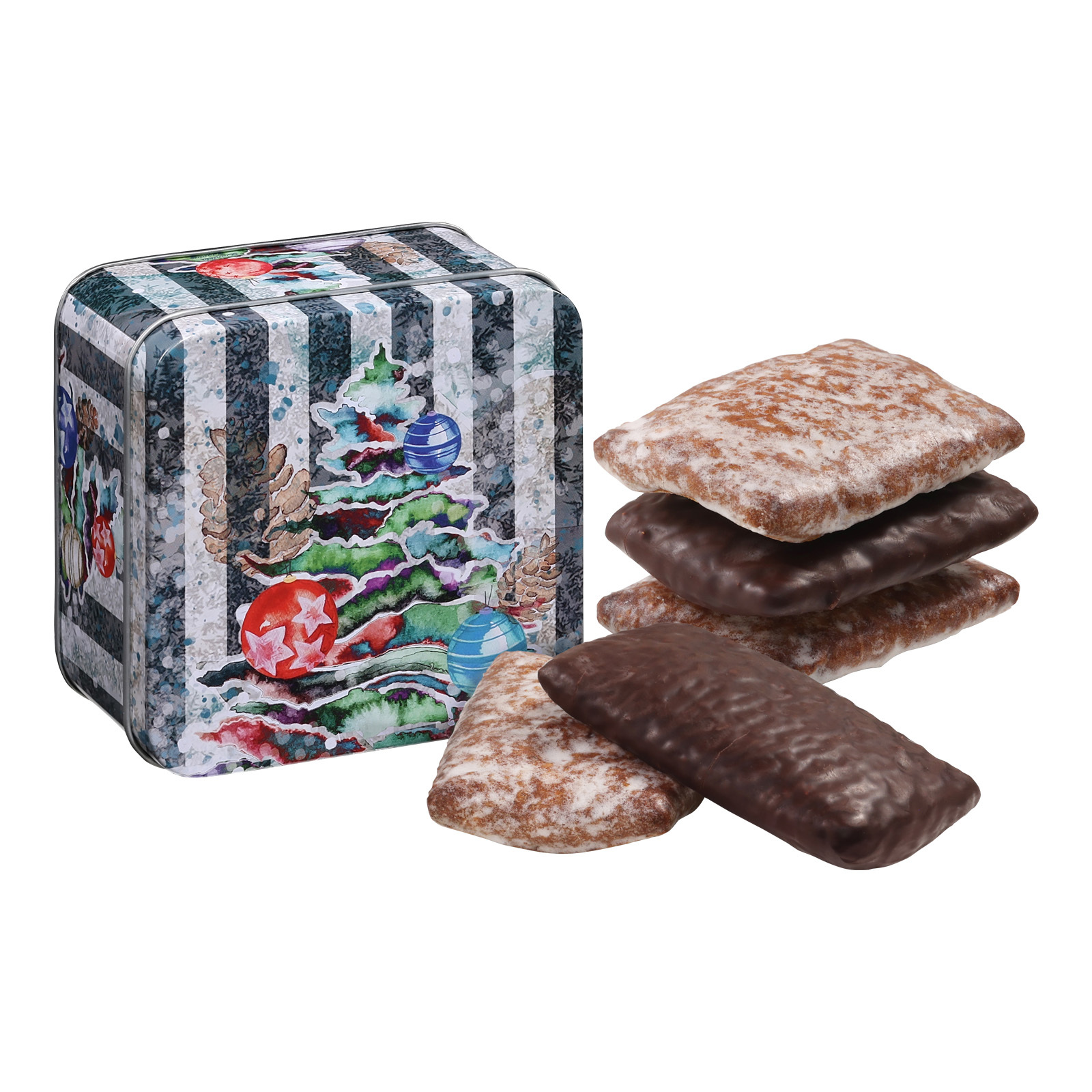 The festive Christmas tree tin combines an atmospheric design with delicious mixed Elisen slices. Filled with five of the finest slices made according to a traditional recipe, it is an ideal gift for the Christmas season.