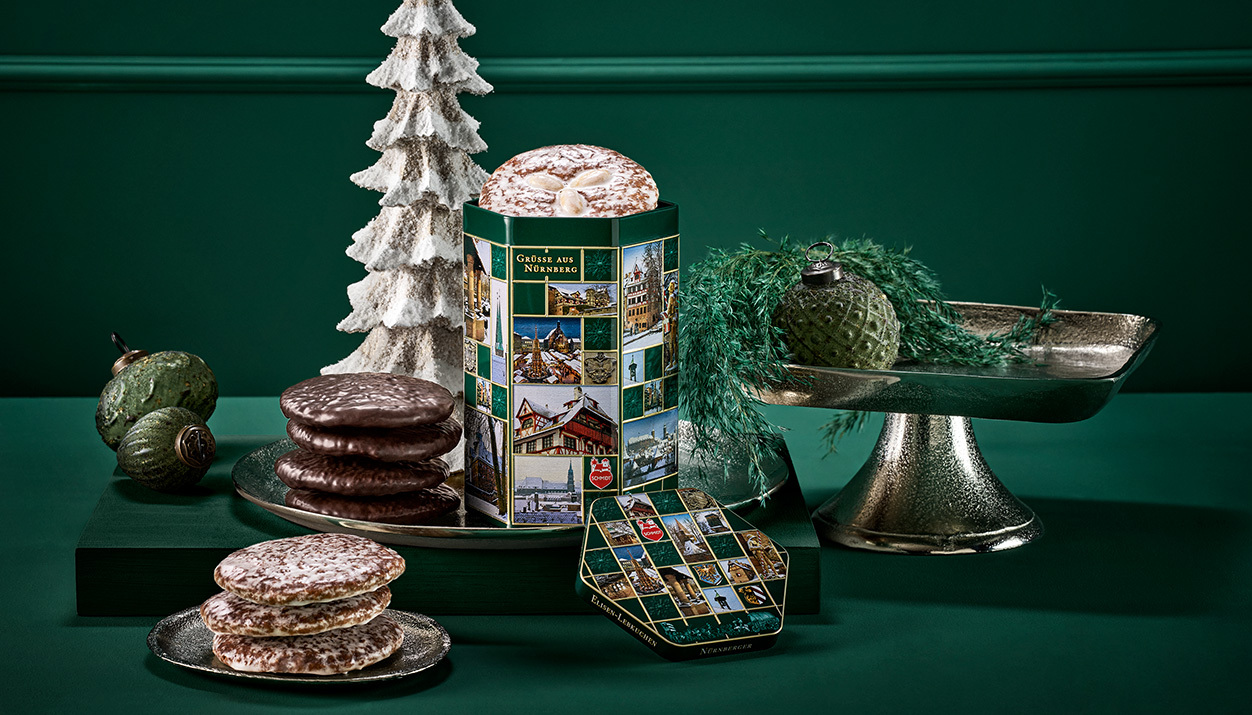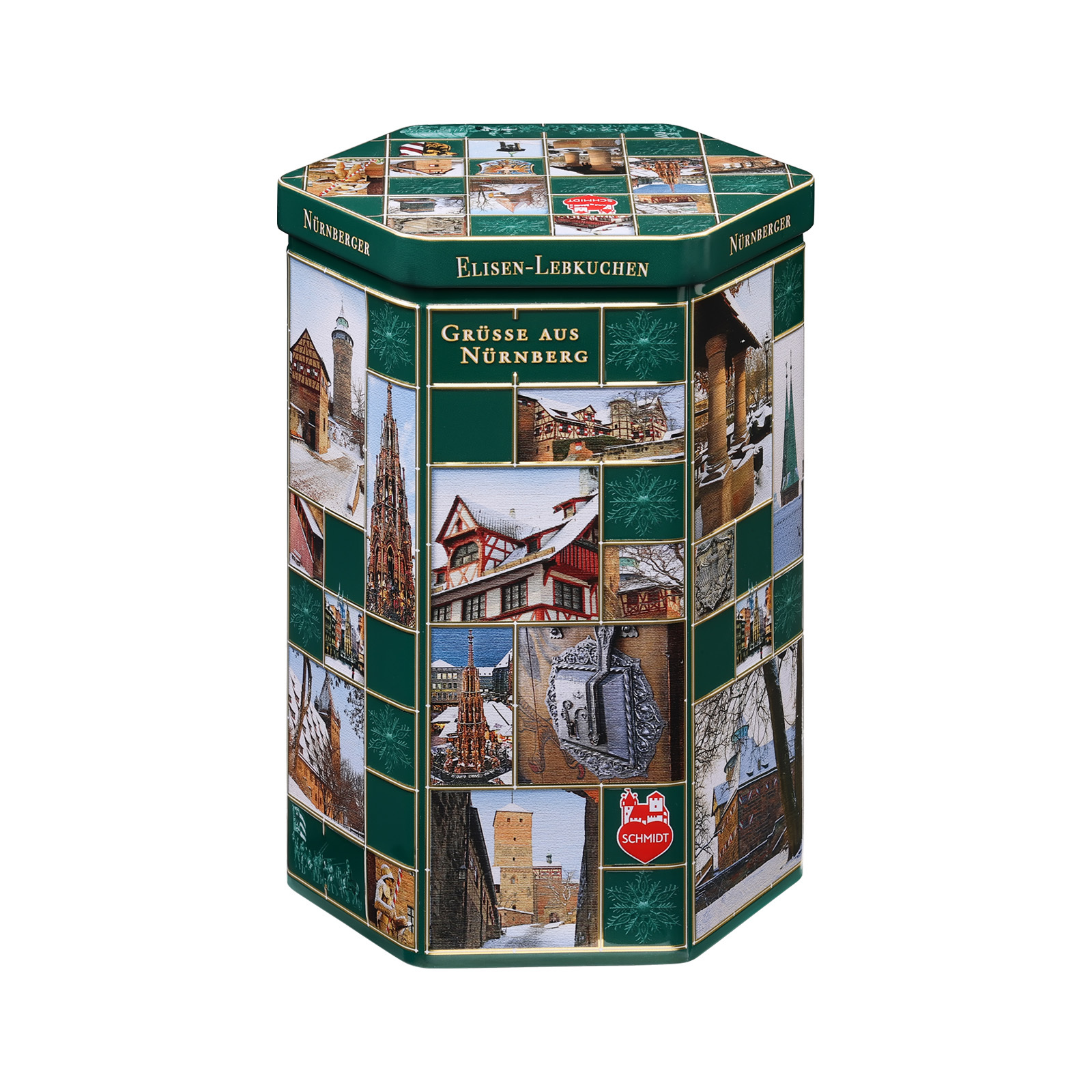 Also at Christmas it can be said: The round has to go into the square. And that's best under the Christmas tree. Because we have packed our fine Elisen gingerbread mix in a beautiful hexagonal decorative box. You don't need any more wrapping paper, because the tin is impressive enough in itself! We have embossed it with a high-quality design - on it you can marvel at various Nuremberg sights.