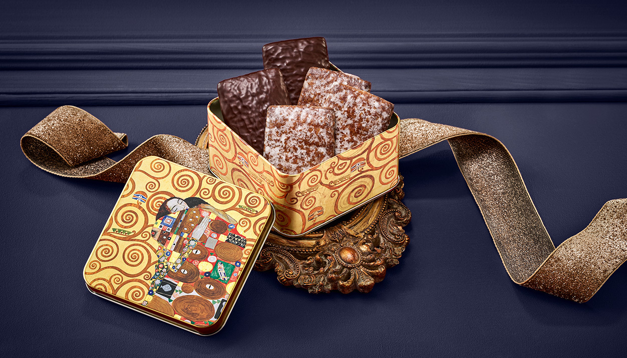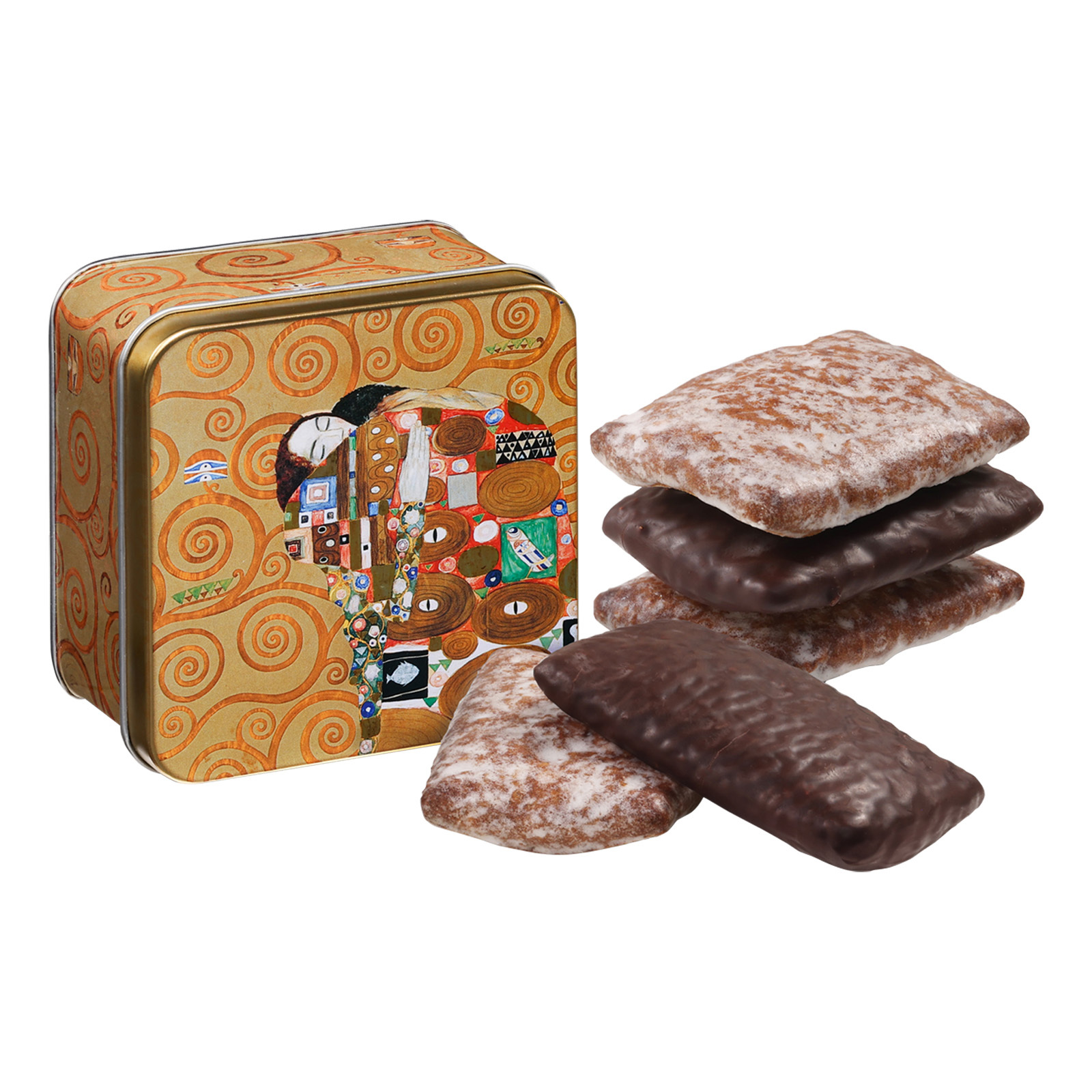 Lebkuchen art, artfully packaged: our artistic tins have long been cult items and collectors' pieces, and we are always coming up with new designs. For the tin containing five of the finest mixed Elisen slices, we chose ‘Die Erfüllung’ (The Fulfillment), a work by the famous Viennese painter Gustav Klimt (1862–1918).