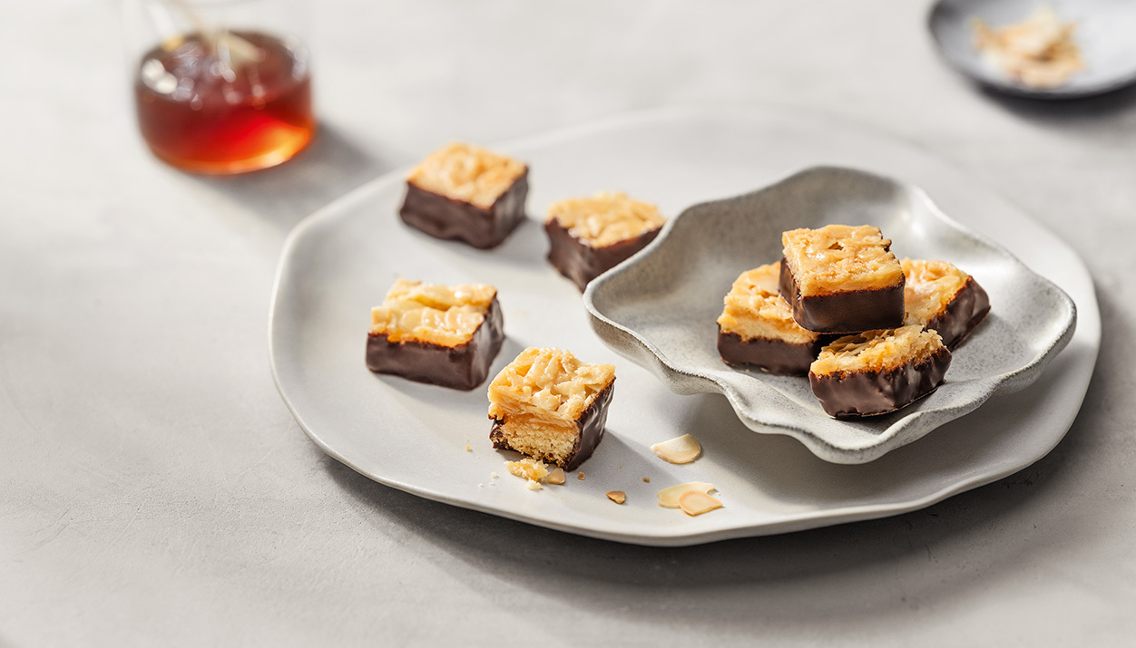 The crunchy Florentine nuts on top create a sweet contrast to the tart marzipan and the whole thing is coated in the finest Belgian dark chocolate. A dream in cube form!