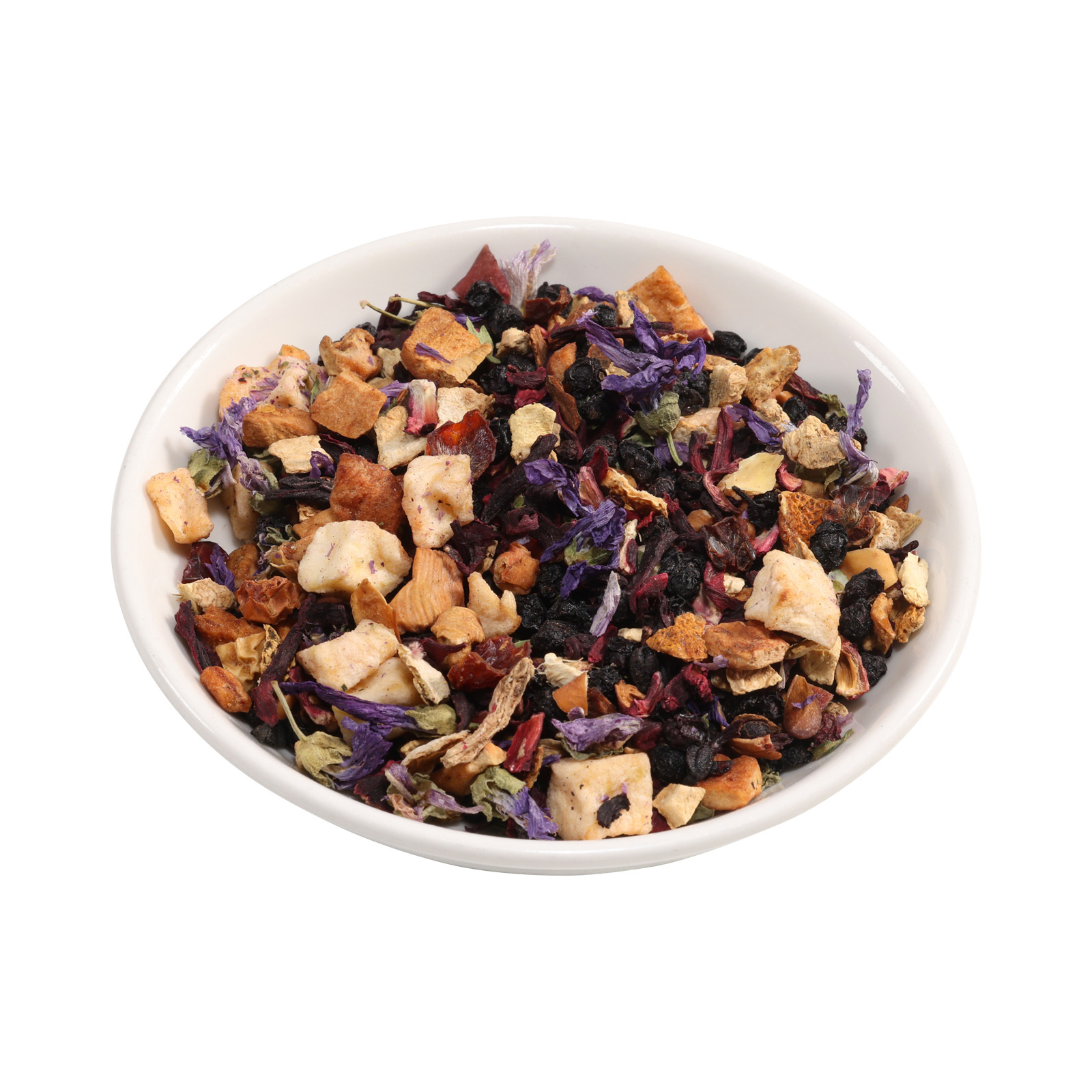 | Ingredients | Ingredients: Elderberries, apple bits, hibiscus flowers, ginger, lemon peels, cinnamon, rosehip peels, mallow blossoms, stevia leaves, marzipan flavour, blueberries. |