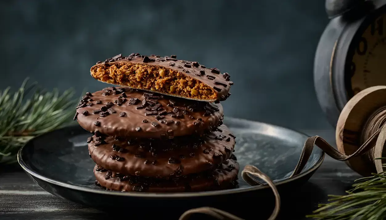In particular cases, some modifications of this document's contents may have been effected after publication. Therefore, please kindly check the ingredient list and the nutritional information on the product packaging itself before consumption. Nuremberg Elisen-Gingerbread (Lebkuchen) cookies with whole milk chocolate and chocolate flakes