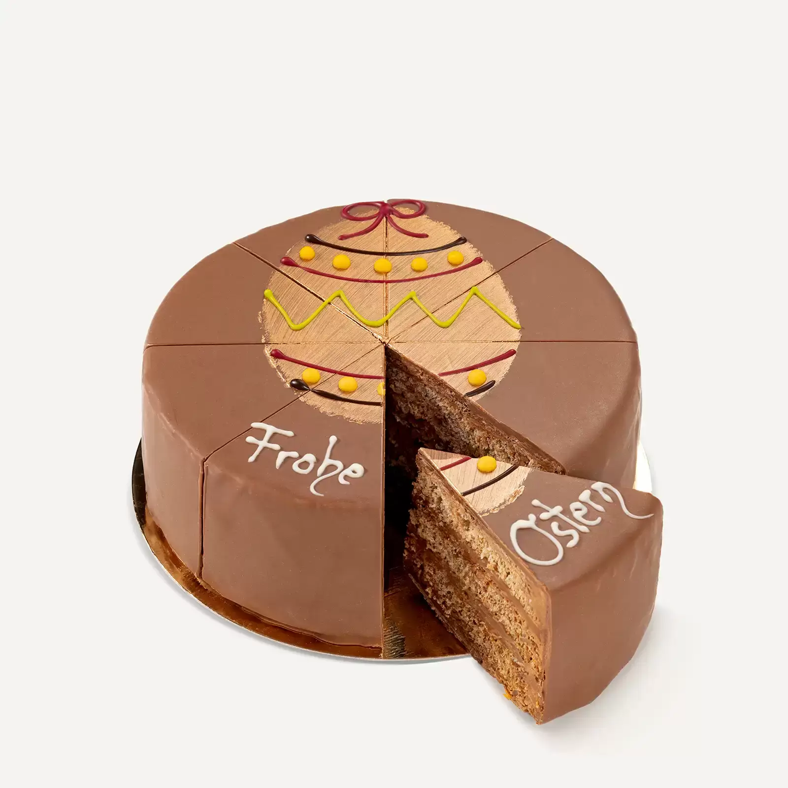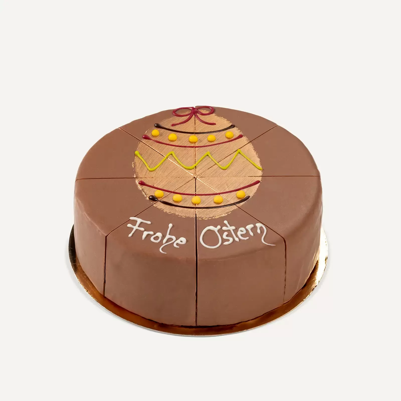 The cake is wrapped in smooth Belgian milk chocolate, and is decorated with an ornate golden Easter egg and the inscription "Happy Easter."