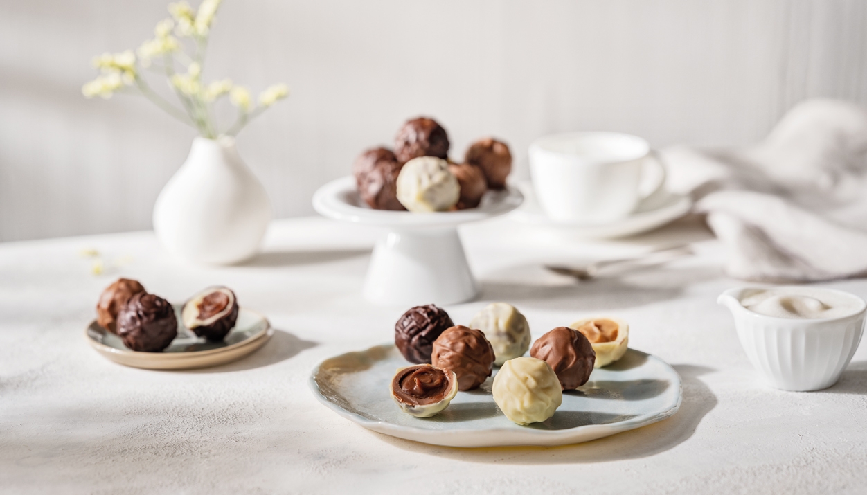 Only the finest truffle chocolates offer this experience for all the senses: First the chocolate cracks deliciously crisp, and then the creamy filling comes and surprises with exquisite flavours.