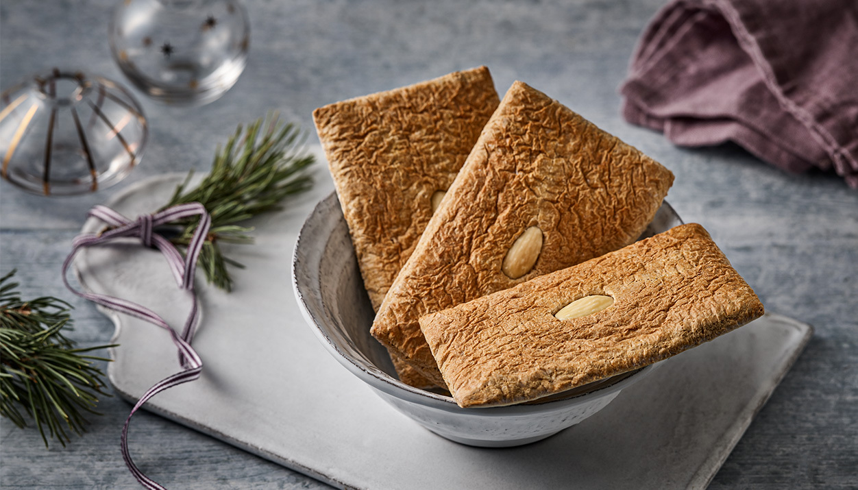 Ingredients: WHEAT FLOUR, sugar, LIQUID WHOLE EGG, orange peels, glucose-fructose syrup, ALMONDS 2%, invert sugar syrup, EGG YOLK POWDER, spices (contain cinnamon), potato starch, humectant: sorbitol; honey, raising agent: sodium hydrogen carbonate; lemon juice concentrate, MILK PROTEINS, salt.
